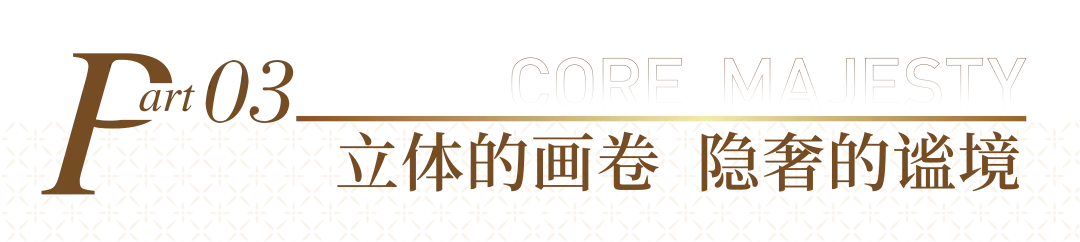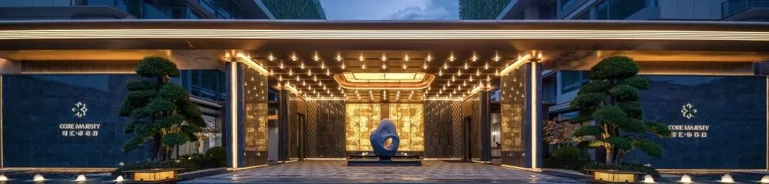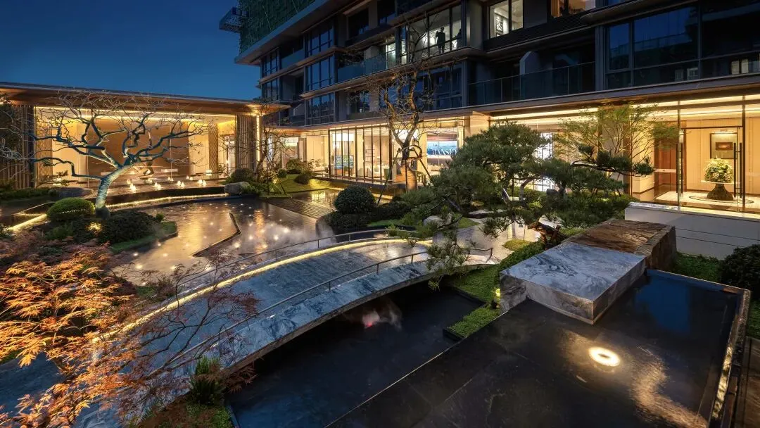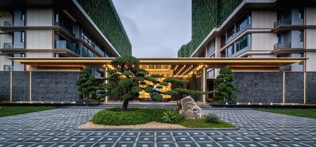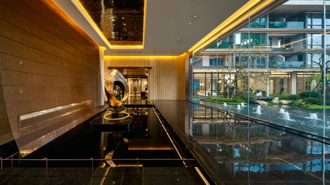 归家的尊崇感,自第一眼便开始谱写。约50米超阔尺度、约6米挑高的巍然府门,以宏大气场定义归家序章。门厅顶部,金色铝板与灯光交相辉映,形成“金镶玉”的视觉美学。门前,一株树形宽度近7米的罗汉松苍劲镇守,辅以长青女贞与镜面水景,于当代建筑中巧妙融入“藏风聚气”的东方礼制哲思,将归家仪式感拉升至极。