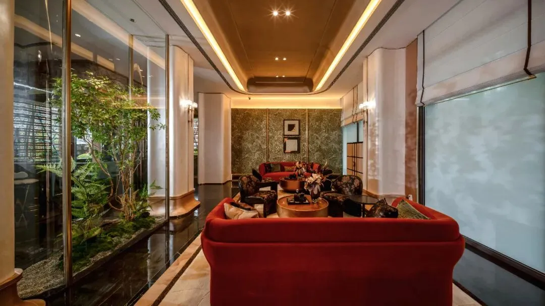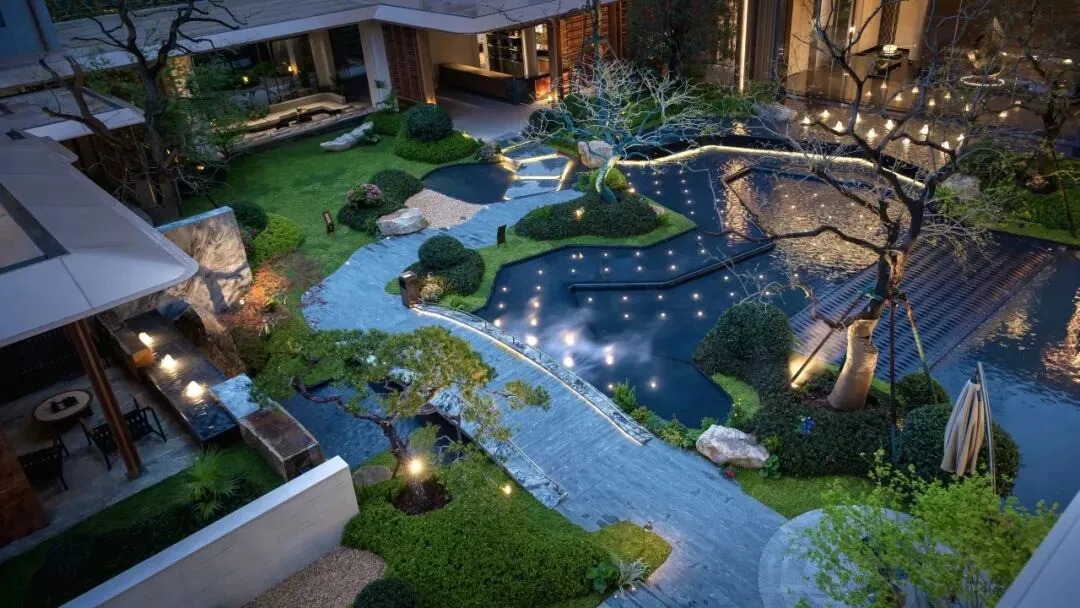 穿过府门,喧嚣褪去,一方隐逸谧境徐徐展开。园林灵感汲取自徽派古典园林的写意与安缦酒店的隐逸美学。中心水景如明镜铺陈,与景石、花木共绘立体山水长卷。一座浮桥轻盈凌波,仿佛将“两水夹明镜,双桥落彩虹”的诗意化为现实。驻足于红洞石砌就的拈影亭内,看树影婆娑,听水声潺潺,于城央繁华里,觅得一处可安放身心的精神桃源。