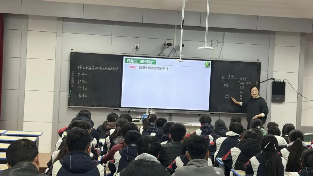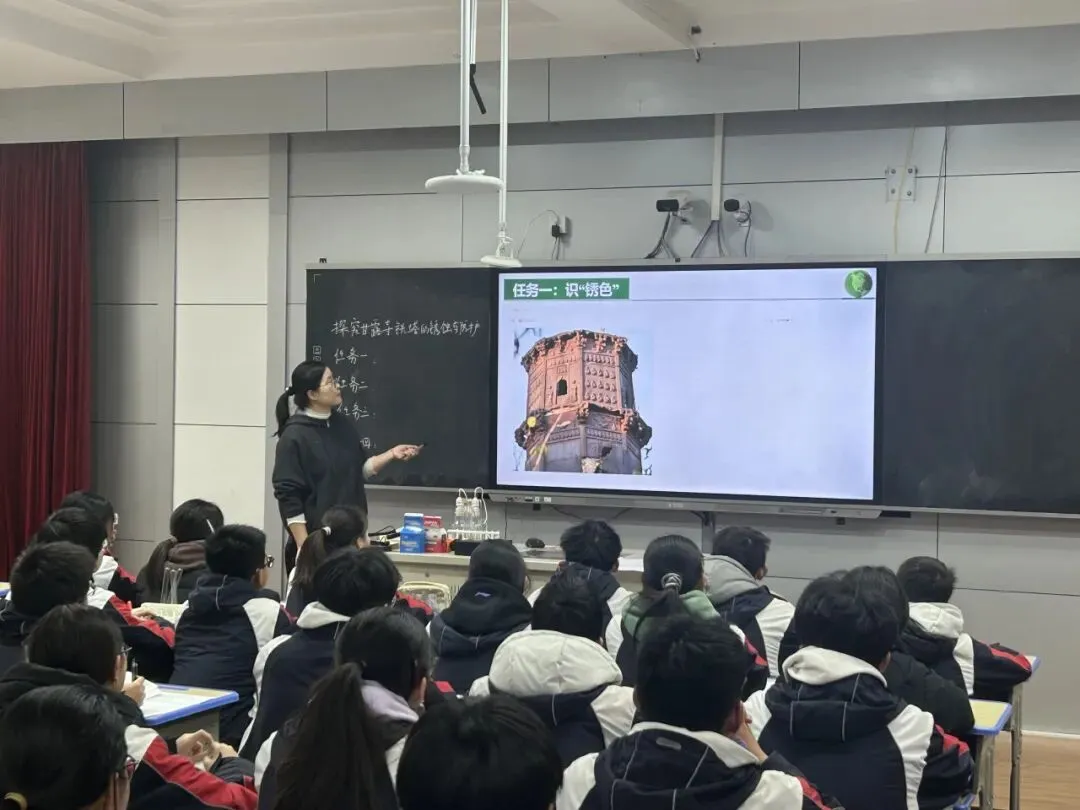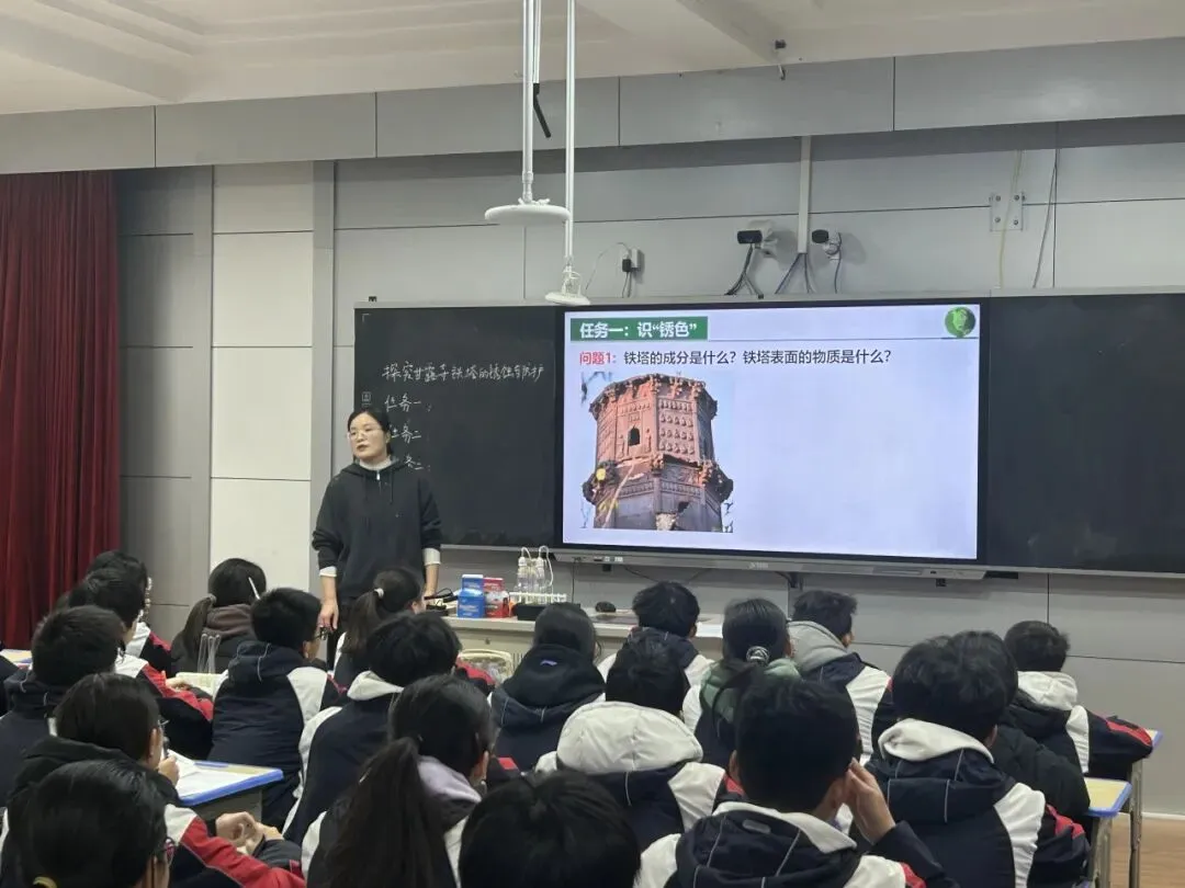 课堂展示精彩纷呈。郑佳钰老师的《探秘食品脱氧剂》从生活小事切入,引导学生层层深入探究成分与原理,展现了化学的生活魅力;朱彩萍教研员的《锈色古香-探究甘露寺铁塔的锈蚀与防护》更是高屋建瓴,以甘露寺铁塔为载体,将金属锈蚀知识与文物保护文化完美融合,极具育人价值。