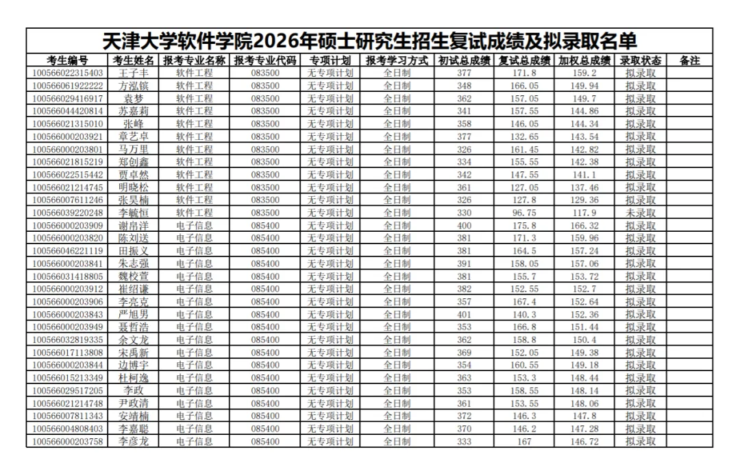 天津大学软件学院2026年硕士研究生复试成绩及拟录取名单公示