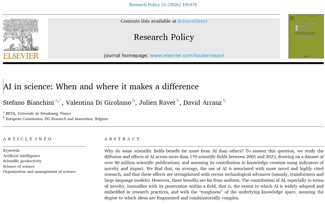 Bianchini, S., Di Girolamo, V., Ravet, J., & Arranz, D. (2026). AI in science: When and where it makes a difference. Research Policy, 55, 105478. https://doi.org/10.1016/j.respol.2026.105478 - [2]