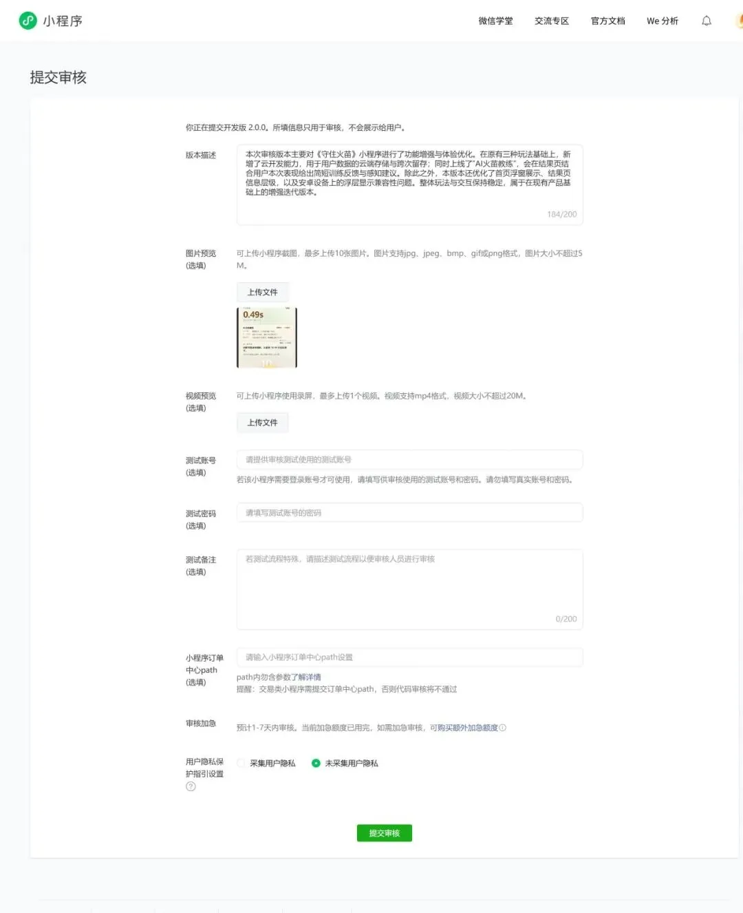 用户隐私保护要如实填入:收集哪些数据(如用户昵称、挑战记录)、存储多久、是否分享、需要用户哪些权限等;比如,如果有"分享朋友圈"功能,必须说明会获取用户的微信头像和昵称;