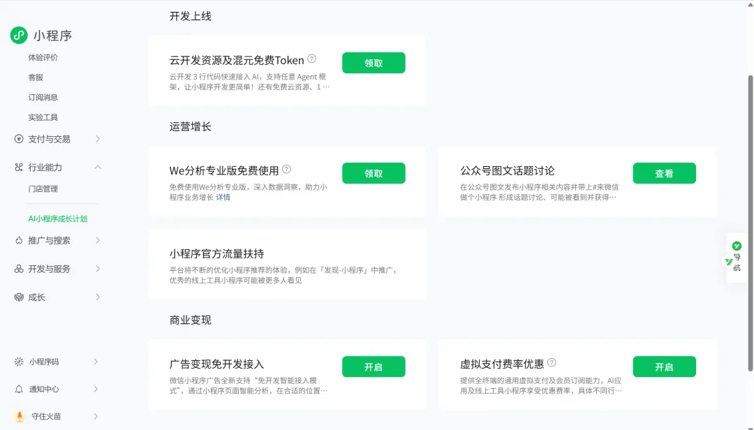流量主不是小程序上线后自动开启的。需要在后台单独申请,而且需要满足:累计独立访客(UV)≥ 500、无违规记录、内容合规。目前,微信对AI小程序开发有成长计划,可以在小程序后台报名参与(仅限部分类目),提供流量扶持以及云开发免费资源: