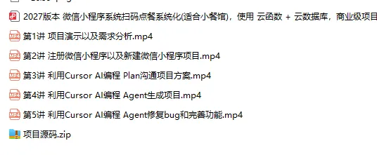 ├── miniprogram/ # 小程序前端│ ├── app.js # 应用入口,云环境初始化│ ├── app.json # 页面路由与全局配置│ ├── app.wxss # 全局样式│ ├── pages/ # 页面目录│ │ ├── login/ # 登录页(手机号绑定)│ │ ├── frozen/ # 账号冻结提示页│ │ ├── index/ # 顾客首页(热门菜品)│ │ ├── menu/ # 分类菜单与点餐│ │ ├── order-confirm/ # 订单确认页│ │ ├── order-result/ # 下单结果页│ │ ├── my-orders/ # 我的订单│ │ └── admin/ # 管理员模块│ │ ├── index/ # 今日数据统计│ │ ├── orders/ # 订单管理│ │ ├── categories/ # 分类管理│ │ ├── dishes/ # 菜品列表│ │ ├── dish-edit/ # 菜品编辑│ │ ├── tables/ # 桌号管理│ │ └── users/ # 用户管理│ ├── components/ # 公共组件│ │ └── tab-bar/ # 自定义底部导航栏│ ├── utils/ # 工具模块│ │ ├── auth.js # 登录与权限│ │ ├── adminOrderWatcher.js # 新订单监听器│ │ └── util.js # 通用工具函数│ ├── audio/ # 音频资源(新订单提示音)│ └── images/ # 图片资源│├── cloudfunctions/ # 云函数目录│ └── diancan/ # 主云函数│ ├── index.js # 入口,action 路由分发│ ├── config.json # 权限与超时配置│ ├── package.json # 依赖(wx-server-sdk)│ └── handlers/ # 业务处理模块│ ├── common.js # 公共初始化与工具│ ├── user.js # 用户相关│ ├── category.js # 分类相关│ ├── dish.js # 菜品相关│ ├── table.js # 桌号相关│ ├── order.js # 订单相关│ ├── userManage.js # 用户管理│ └── init.js # 初始化数据│├── project.config.json # 小程序项目配置└── project.private.config.json # 本地私有配置云数据库集合