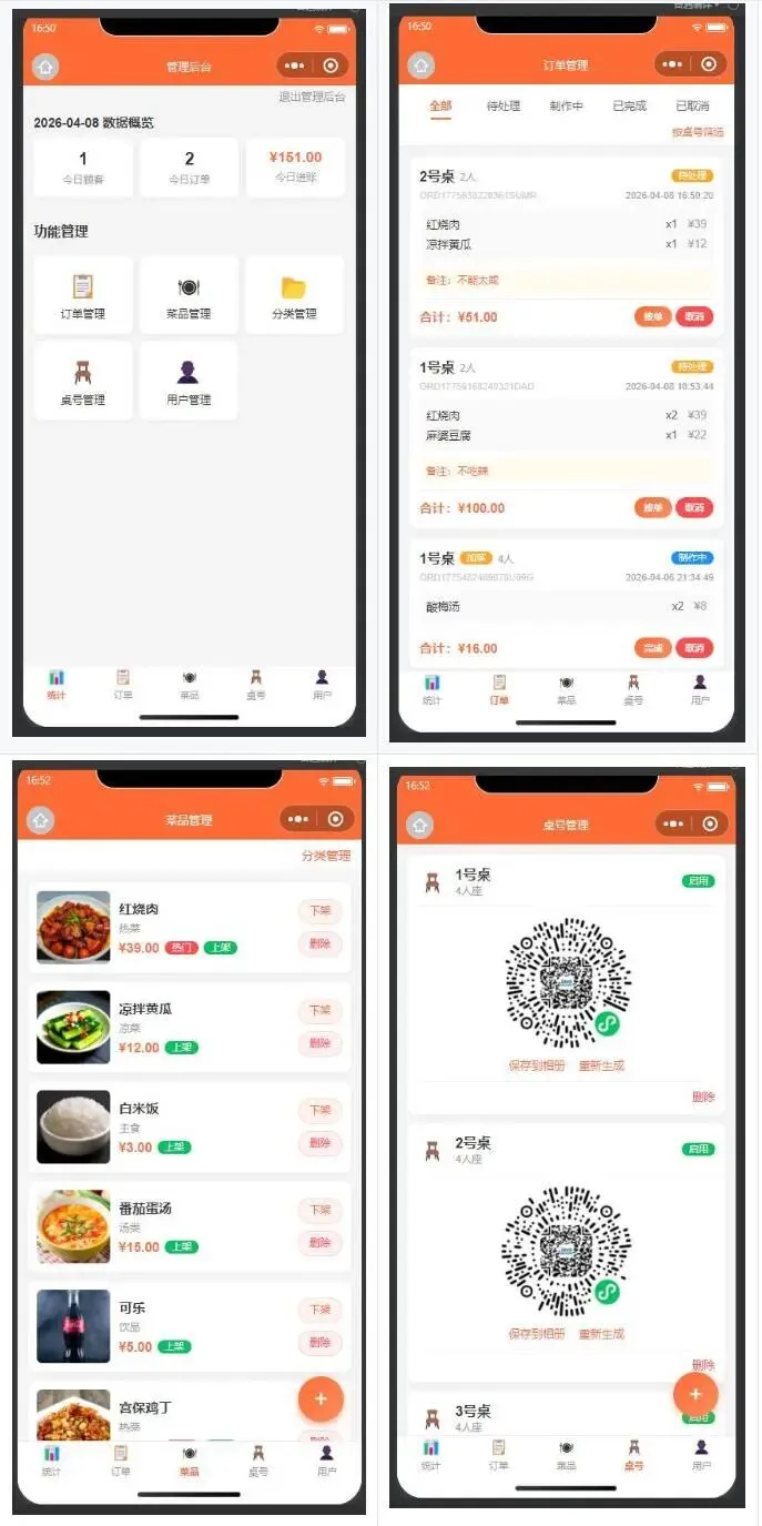 :菜品的增删改,支持图片上传、热门标记、上下架控制 - 桌号管理