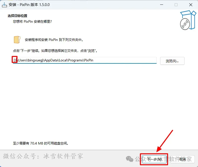 4.修改路径地址中的第一个字符C可更改安装位置(如:把C改为D软件将安装到D盘),点击【下一步】。
