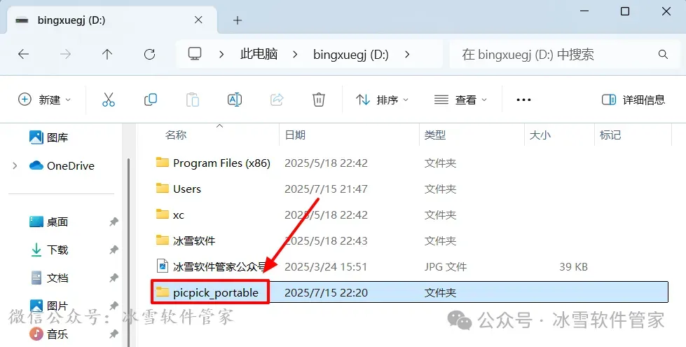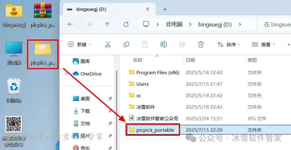 2.将解压后的【picpick_portable】文件夹拖动到【安装磁盘位置,如D盘】。