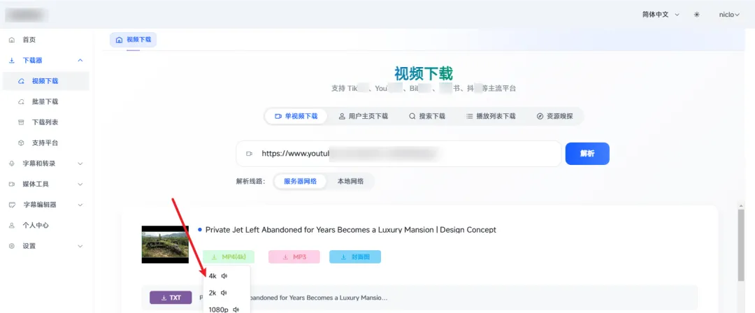 工具大致原则就是:你能在网站能正常播放的视频,复制链接扔进去试一手就行。而且清晰度方面也不抠门,原视频最高支持多少,它就给你老老实实列出来多少,4K、2K都在,前提是人家作者本身就上传了高码率的版本,这个不能强求。