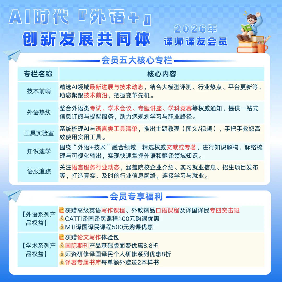 当下外语学习与AI技术深度融合,不管是高校教师、翻译从业者,还是翻译专业学生,都需要一套系统、高效且高性价比的成长方案——既要有长期可复用的学习资源,也要有实战交流的平台,更要有可落地的实操指南。这一次,我们推出专属福利套餐,将AI时代『外语+』创新发展共同体年度会员 +《AI翻译实战手册》 + 翻译实战深度共读社群三大核心权益一次性打包,助你从“困境”走向“赋能”。