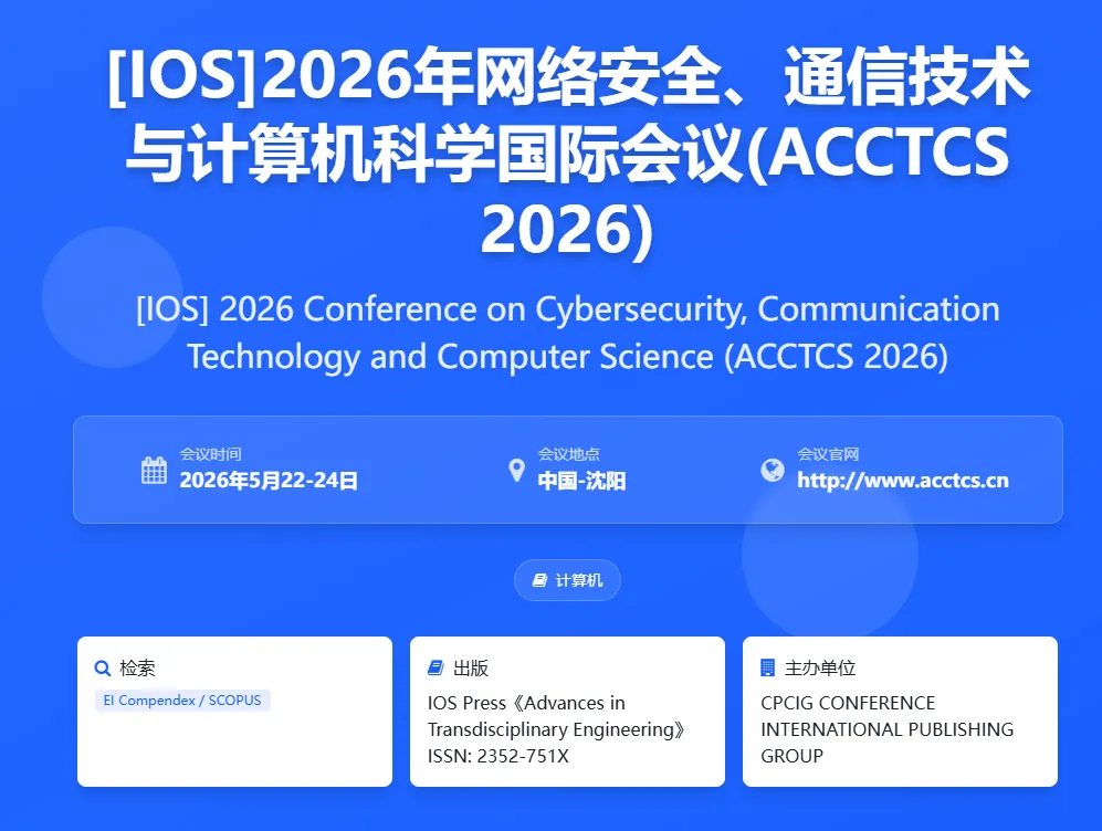 [IOS]2026年网络安全、通信技术与计算机科学国际会议(ACCTCS 2026)将于2026 年 5 月 22 日至 24 日在中国辽宁省沈阳市举办。
