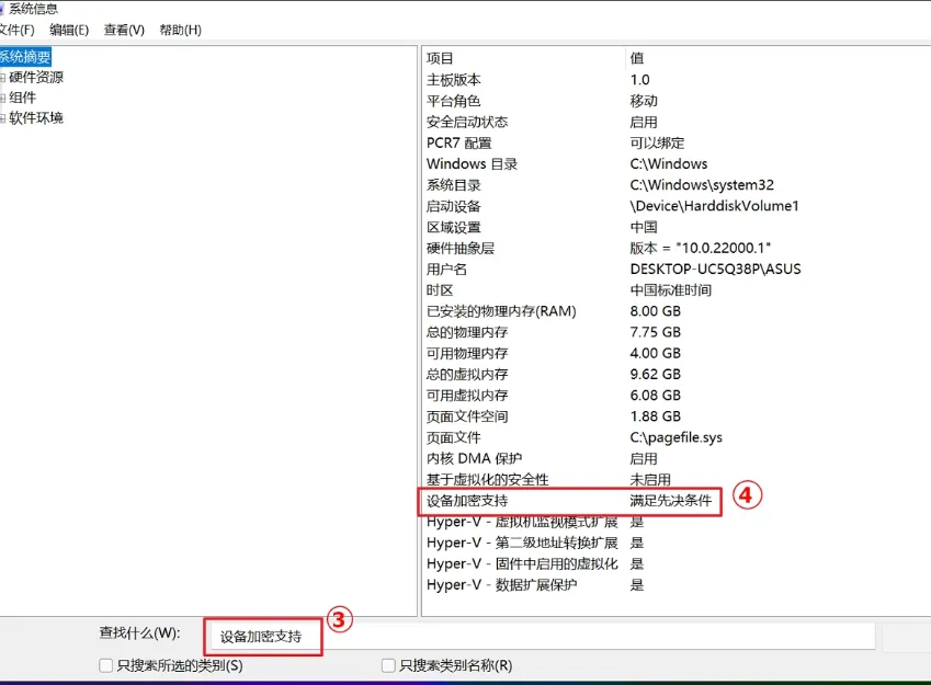 - 在窗口底部找到“设备加密支持”,如果显示“满足先决条件”,说明可以用