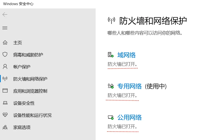 - 查看当前网络(通常是“公用网络”)下的防火墙状态,确保是“已启用”