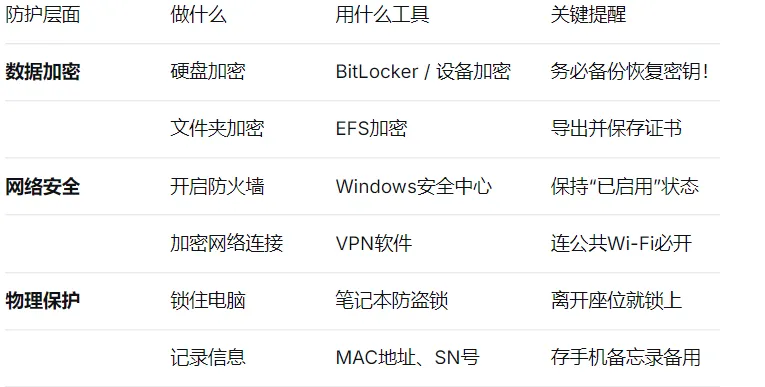 笔记本电脑的安全其实就三件事:数据加密让人偷不走文件,安全联网让人截获不了密码,物理锁让人拿不走电脑。这几步花不了多少时间和钱,但能让你少操很多心。如果觉得有用,欢迎点赞、在看、分享给身边的朋友!