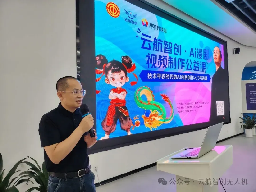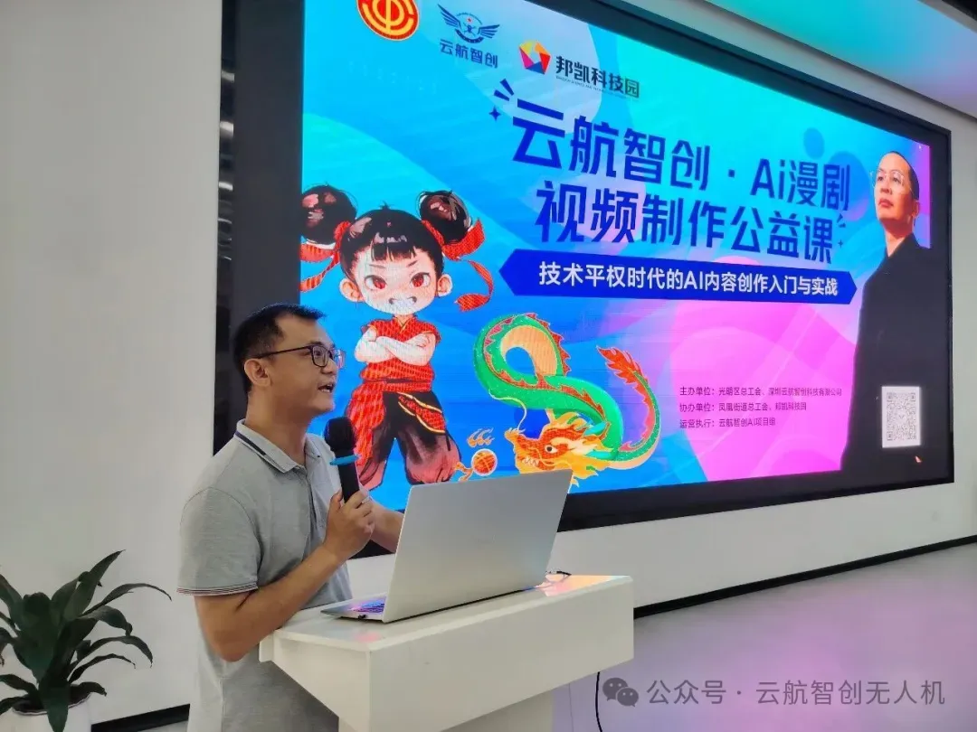 4月11日下午,由光明区总工会、深圳云航智创科技有限公司主办,凤凰街道总工会、邦凯科技园协办,云航智创AI项目组策划执行的“云航智创·AI漫剧/视频制作公益课”在光明区邦凯科技园圆满举办。本次活动以“轻量化、沉浸式、实操型”为特色,吸引了对AI漫剧创作感兴趣的职场新人、新媒体从业者及文创爱好者积极参与,用3小时快速建立AI创作的系统认知并上手核心工具。