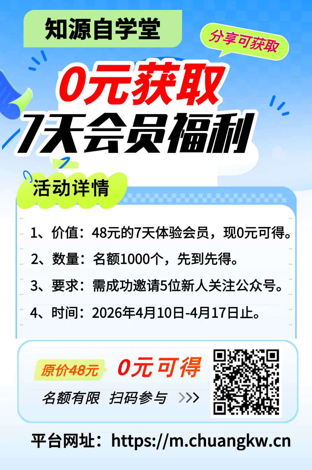 本周活动:0元领取(知源自学堂)平台会员!