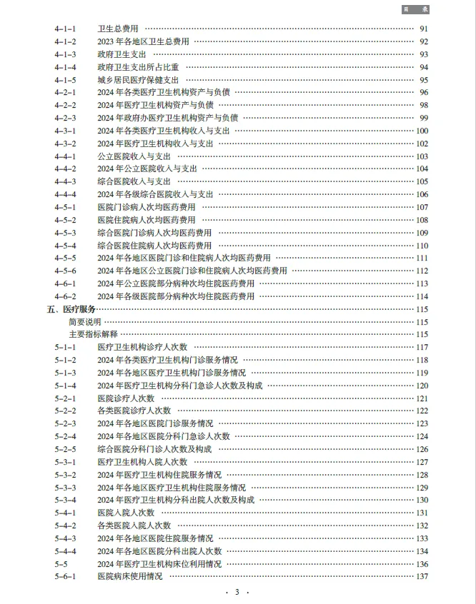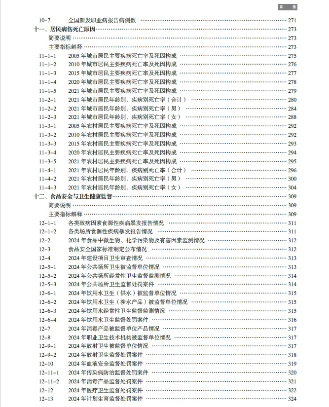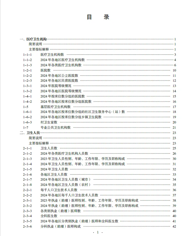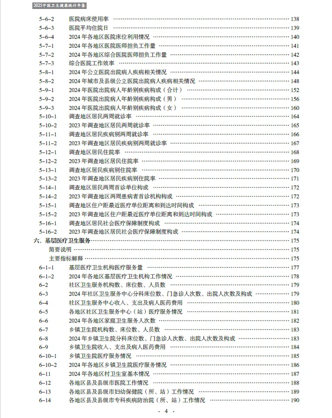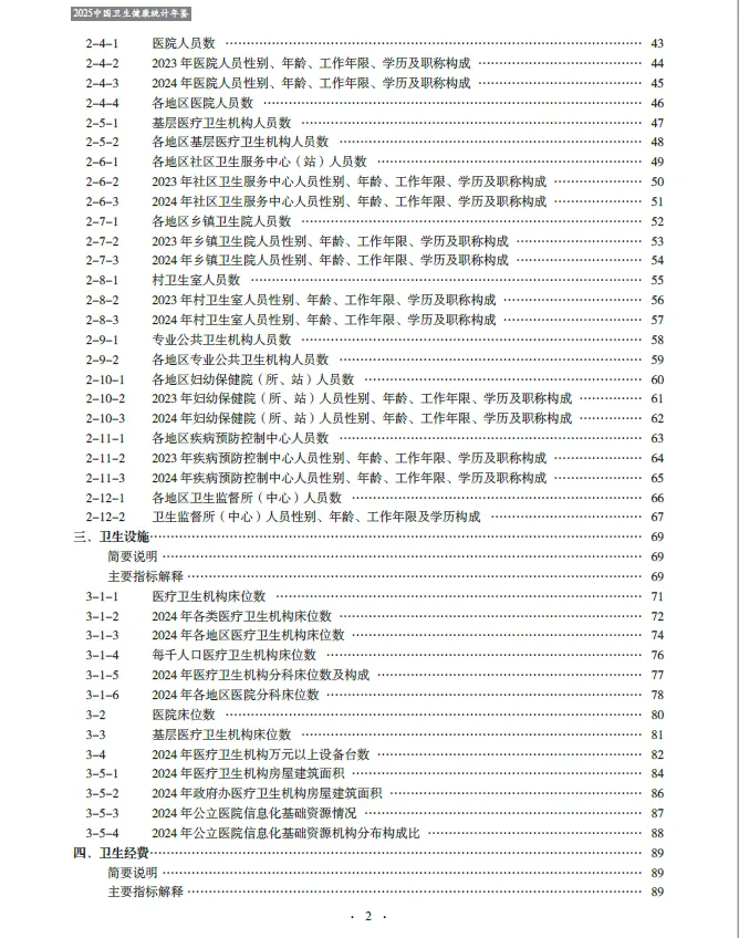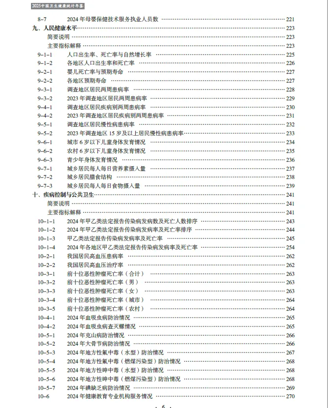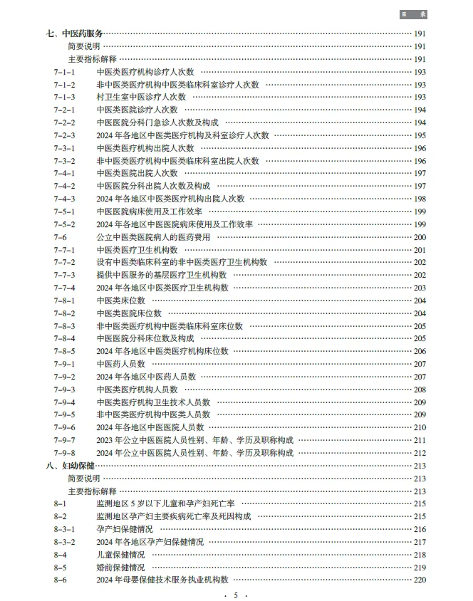 《2025中国卫生健康统计年鉴》收编的内容截至2024年底。二、全书分为16个部分,即医疗卫生机构、卫生人员、卫生设施、卫生经费、医疗服务、基层医疗卫生服务、中医药服务、妇幼保健、人民健康水平、疾病控制与公共卫生、居民病伤死亡原因、食品安全与卫生健康监督、医疗保障、人口指标,另附主要社会经济指标、世界各国卫生状况。各章前设简要说明及主要指标解释,简要说明主要介绍本章的主要内容、资料来源、统计范围、统计方法以及历史变动情况