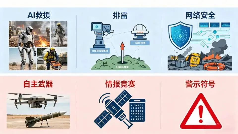 积极:AI用于灾害救援、排雷、网络防护、情报分析,能减少人员伤亡,提升安全防御能力。