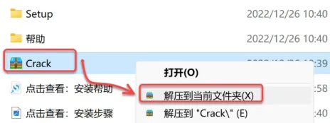 鼠标右击 Crack,选择 解压到当前文件夹。如果安装包里没有 Crack 文件,关闭杀毒软件后重新解压安装包。