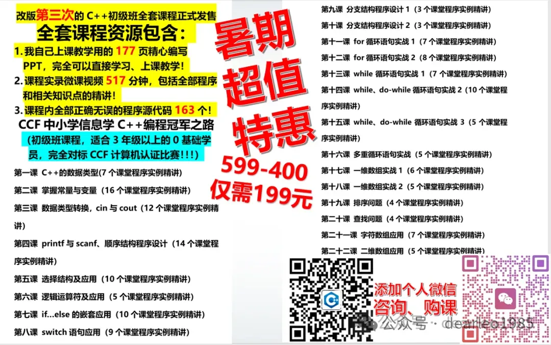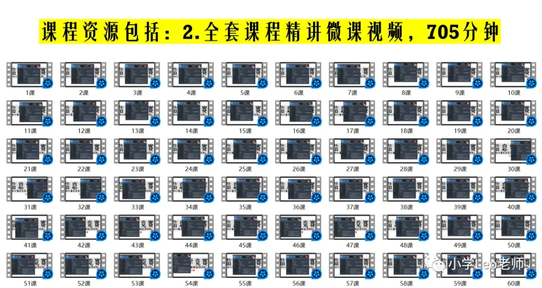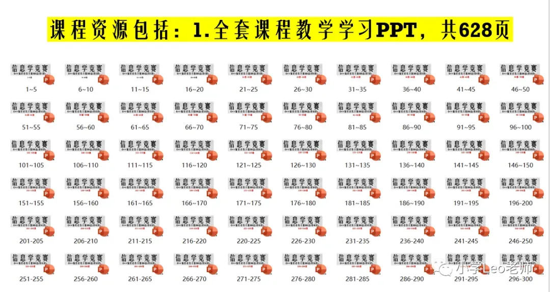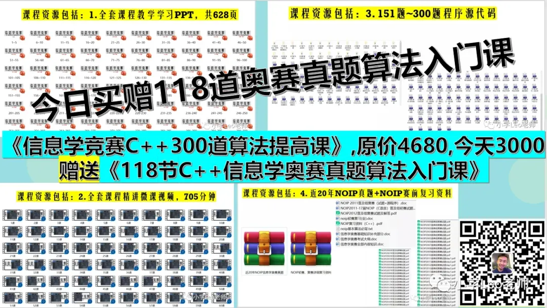 全套课程包含:368道精选真题讲解+628页精心设计教学PPT+705分钟精讲微课视频+150个程序源代码+近20年NOIP真题+NOIP赛前资料