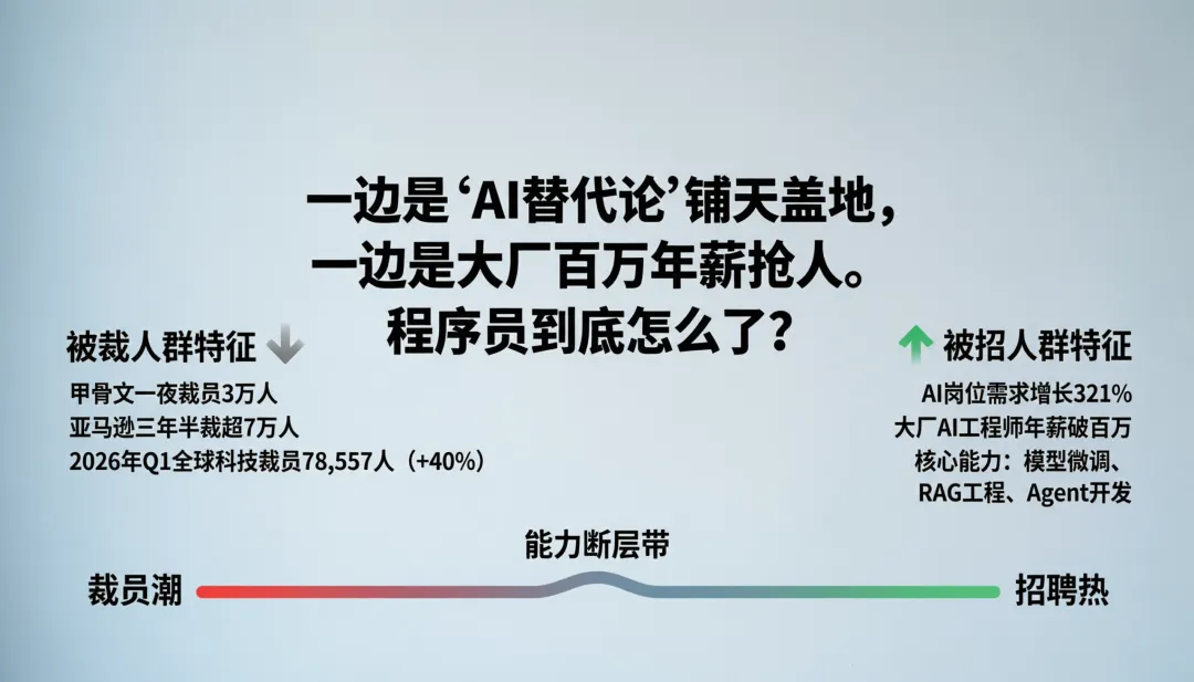 甲骨文一夜裁员3万人。亚马逊三年半裁掉超7万人,2026年仅第一季度就裁了3万。2026年Q1全球科技裁员78,557人,同比增长40%。与此同时,AI岗位需求增长了321%。