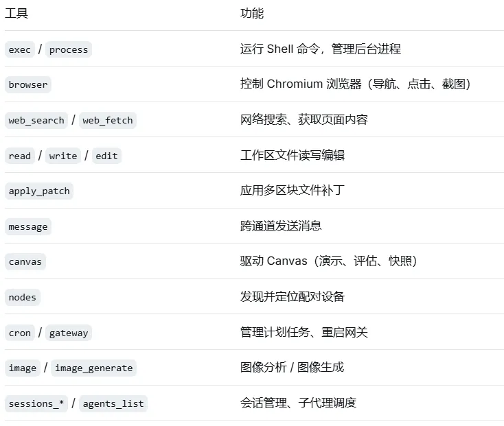 OpenClaw 自带一组内置工具,无需任何插件即可使用: