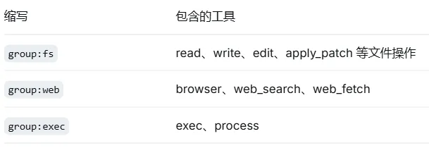 {"tools": {"allow": ["group:fs", "group:web", "my_custom_tool"]}}