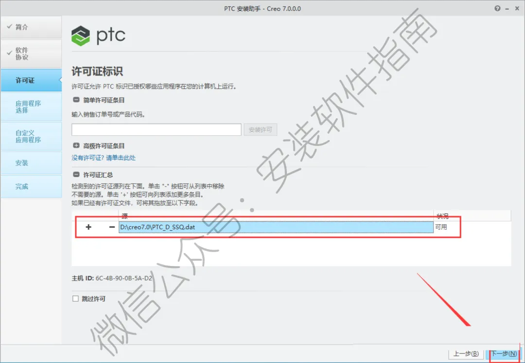 17.系统会自动识别到许可路径,(如果没有识别,点击【添加许可证源】,选择到D:\creo7.0\PTC_D_SSQ.dat 路径即可),然后点击【下一步】