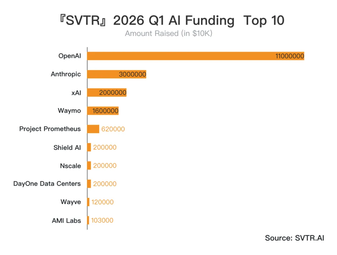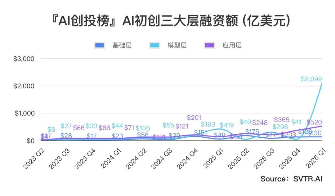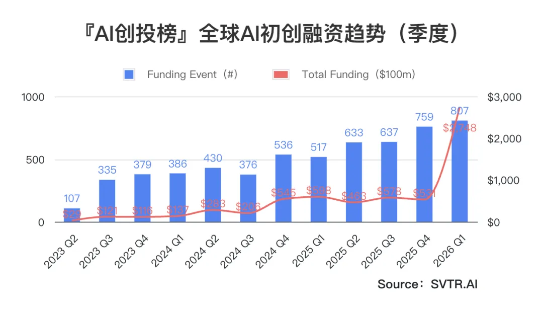 从SVTR追踪的数据看,全球AI初创融资自2023年Q2起持续攀升,但2026年Q1出现了一个明显的"跳变":融资事件数从上季度的759起温和增长至807起(+6.3%),受OpenAI千亿美元融资影响,融资总额从531亿美元暴涨至2748亿美元(+417%)。