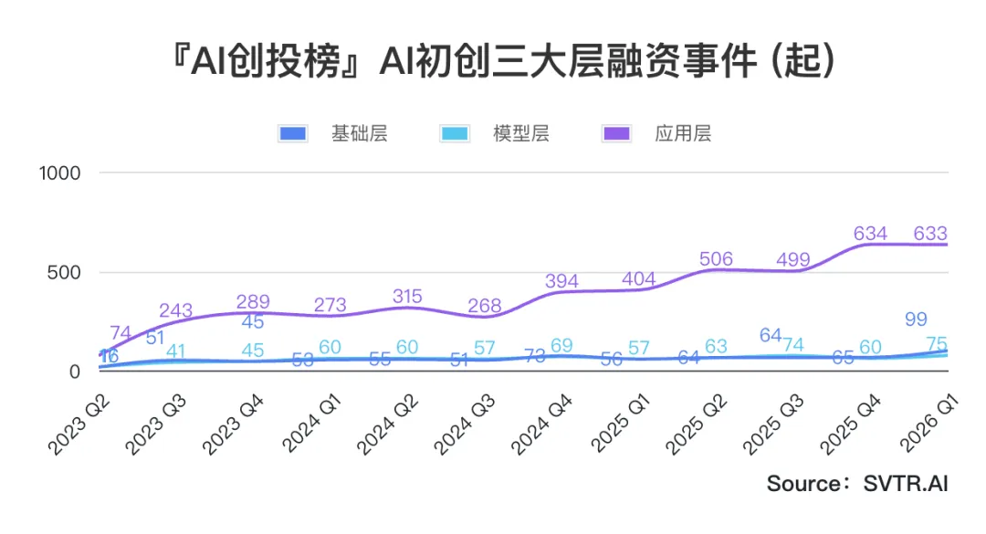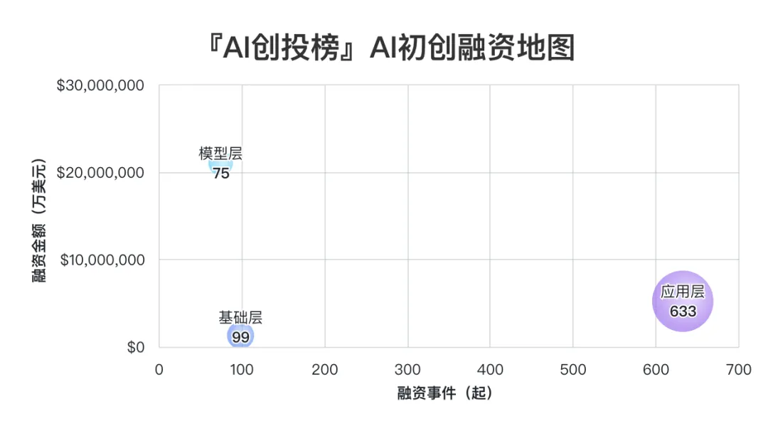 从融资事件数看,应用层以633起(占78.4%)依然是创业活动最密集的战场。这意味着对于绝大多数创业者而言,"做应用"仍然是最现实的路径,但也是竞争最激烈的赛道。