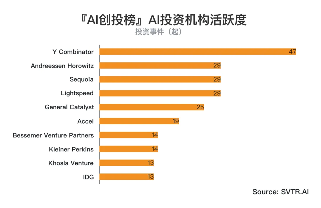 YC依然是AI早期创业最大的"入口",以47起参投遥遥领先。a16z和Sequoia在成长期持续加码。值得注意的是,Softbank通过xAI和Skild AI等超大额投资重回AI投资的中心舞台。