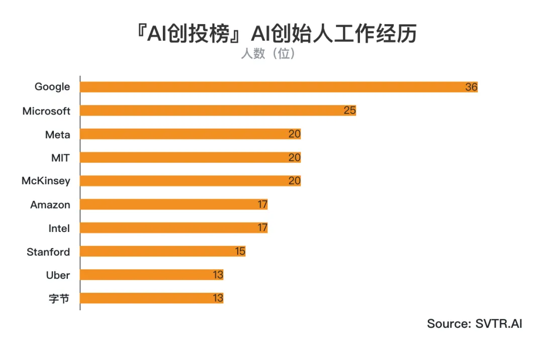 从创始人工作经历来看,Google系、微软系和Meta系创始人最为活跃。McKinsey入榜前五颇为有趣——越来越多的"非技术创始人"正在进入AI赛道,尤其集中在AI+金融、AI+医疗、AI+法律等垂直应用领域。