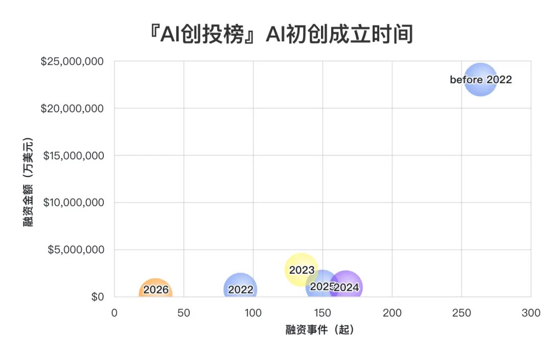2025年以后成立的公司已有150起融资,意味着成立不到一年的AI公司里,每两天就有公司拿到钱。而2026年成立的公司融资事件达到30起,意味着进入2026年,新成立的AI公司,每三天就有一家获得顶级机构的青睐,这个速度在任何历史时期都是罕见的。