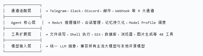 通道适配层:一次配置,全平台可用 —— 同一个 Agent 同时响应 Slack 团队消息、Telegram 指令、邮件自动化请求 工具扩展层:内置工业级工具集,覆盖系统操作、开发运维、办公自动化、物联网(MQTT/Home Assistant)等场景 Agent 核心层:支持长会话记忆、反思式学习、任务自动拆解,具备类人级复杂任务执行能力