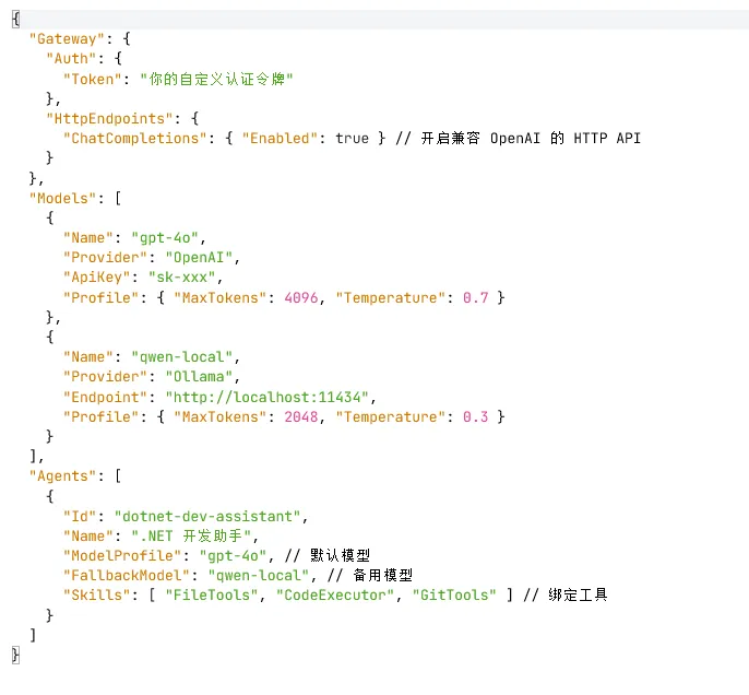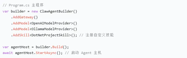.NET 开发助手:自动分析项目代码、生成单元测试、排查 Bug、编译部署 企业内部智能客服:对接企业知识库、OA 系统,内网部署保障数据安全 工业自动化 Agent:结合 MQTT/Home Assistant,控制产线设备、监控服务器状态 多平台智能助理:一个 Agent 同时服务微信、Slack、邮件、Web 多终端 本地私有化 AI 平台:搭配 Ollama 部署国产大模型,打造 100% 本地 AI 战队