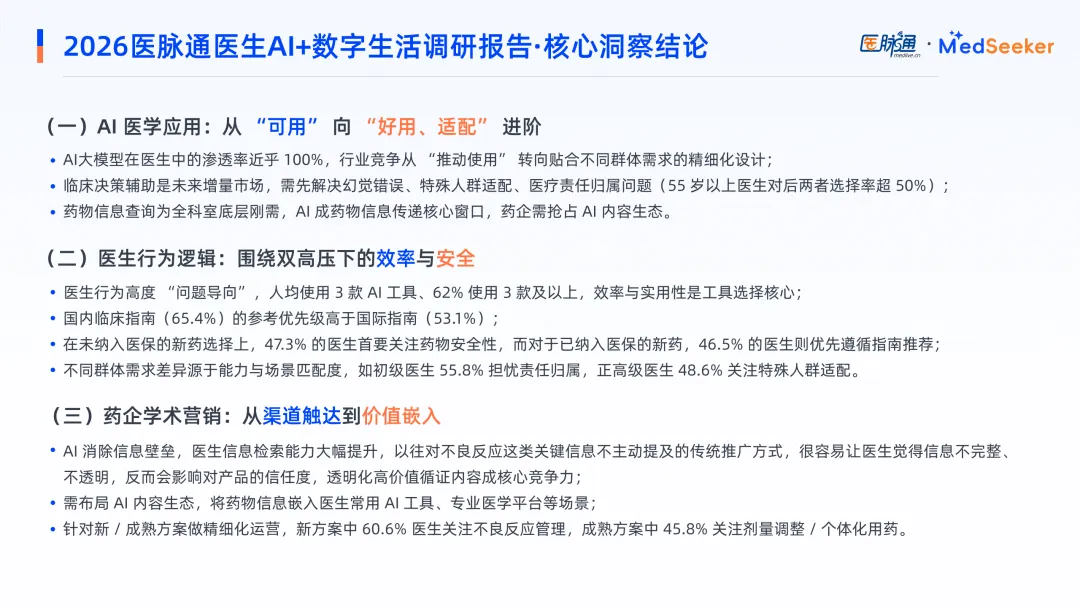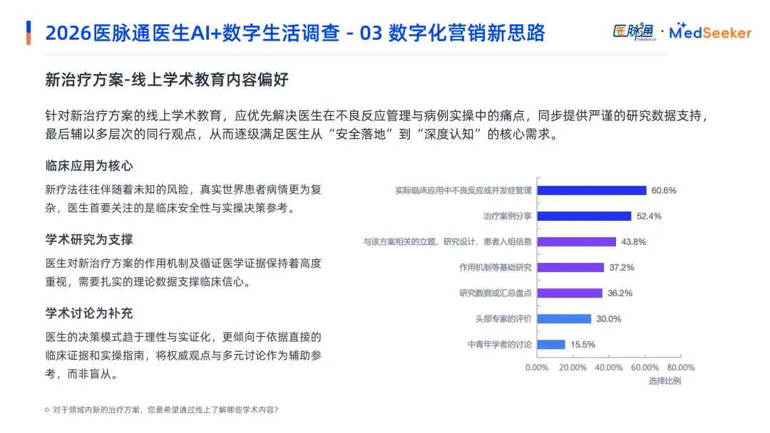 药企学术营销转向价值嵌入与透明化运营,需布局AI内容生态。新治疗方案推广中,医生最关注不良反应管理;成熟方案则聚焦剂量调整与个体化用药,透明、高价值的循证内容成为推广核心竞争力。