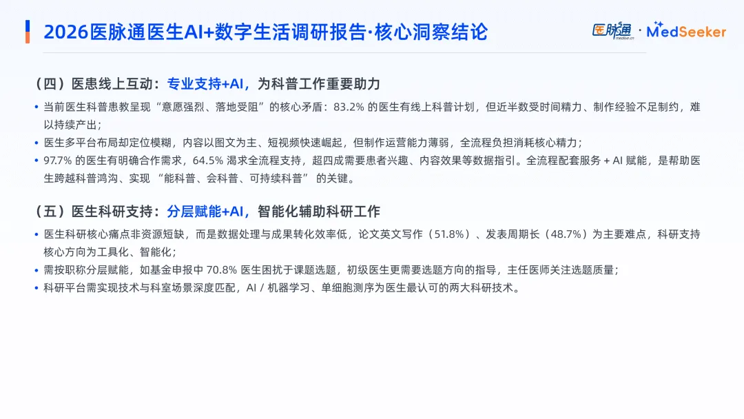 医患线上互动意愿强烈但落地受阻,83.2%医生计划开展线上科普,却近半数受限于时间精力与制作经验。科普以专业医疗平台、图文为主,短视频快速崛起,97.7%医生有合作需求,64.5%渴望选题、制作、运营全流程支持,AI成为破解科普痛点的关键助力。