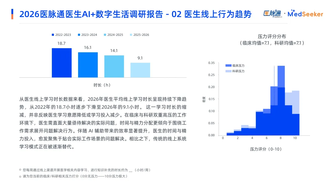 医生行为以问题为导向,在临床与科研双重高压下,优先追求效率与安全。线上学习时长逐年缩减,由2022年18.7小时降至2026年9.1小时,核心因AI大幅提升信息获取效率。医生参考优先级中国内临床指南高于国际指南,新药选择上,未医保药优先关注安全性,医保药优先遵循指南,不同职称医生需求差异显著,初级医生担忧责任归属,正高级医生侧重特殊人群适配。