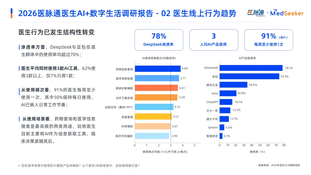 医脉通2026年医生AI+数字生活调研报告基于3038份覆盖24个临床科室的问卷,展现出医学数字化迈入精耕细作新阶段,AI已成为医生日常工作的核心基础设施。