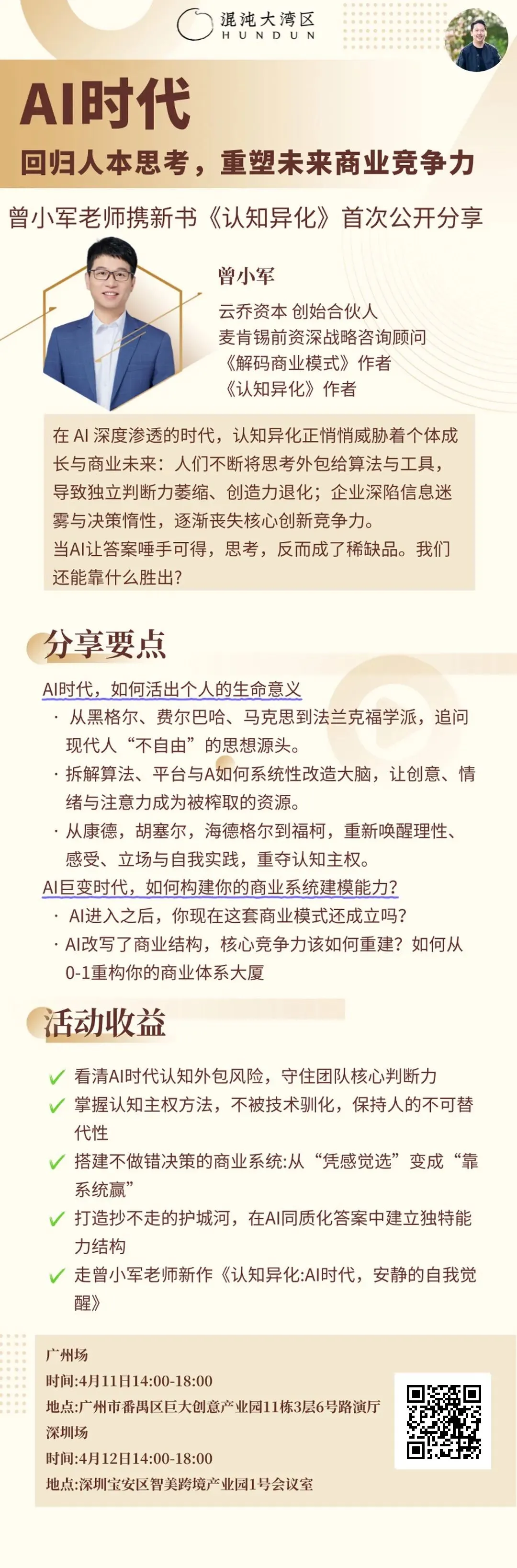 这是我作为混沌大湾区执行社长,在组织曾小军老师新书《认知异化》首次公开分享后写下的学习笔记。当AI越来越像人,人到底该如何不把自己活成工具?当答案越来越便宜,企业真正的竞争力又该重建在哪里?