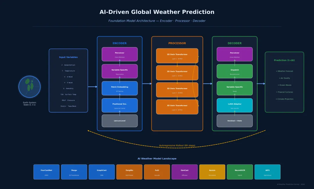 • ClimaX (Microsoft/UCLA, 2023) — 天气+气候基础模型 • Aurora (Microsoft, 2024) — 地球系统基础模型 • W-MAE (2023) — 自监督预训练