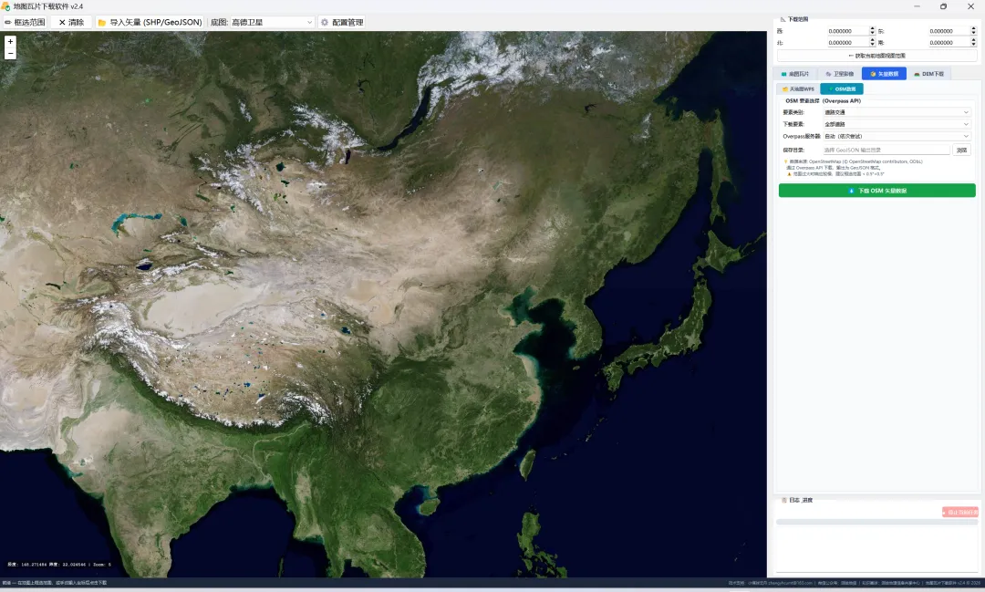 (1)矢量数据下载大幅扩展。 旧版的矢量Tab只能下载天地图WFS的交通、水系、居民地三类数据。新版新增了完整的 OSM Overpass 下载功能,道路、建筑、水系、POI、行政边界、土地利用全部支持,输出 GeoJSON 格式,可直接导入 ArcGIS/QGIS 使用。