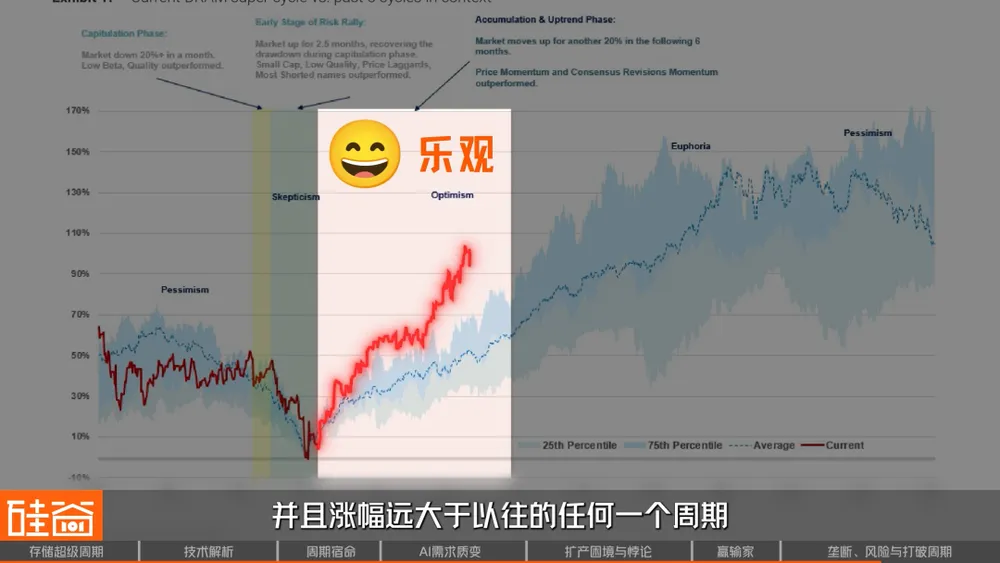 以下这幅图的横轴是以过去五个周期、每轮周期的谷底为零点的时间线,竖轴是市场交易的涨幅。可以看到,每轮周期都会经历四个阶段:悲观、怀疑、乐观、狂热,然后再回到悲观。当前这轮红线走势,我们已经到了“乐观”的这个区间,并且涨幅远大于以往的任何一个周期。
