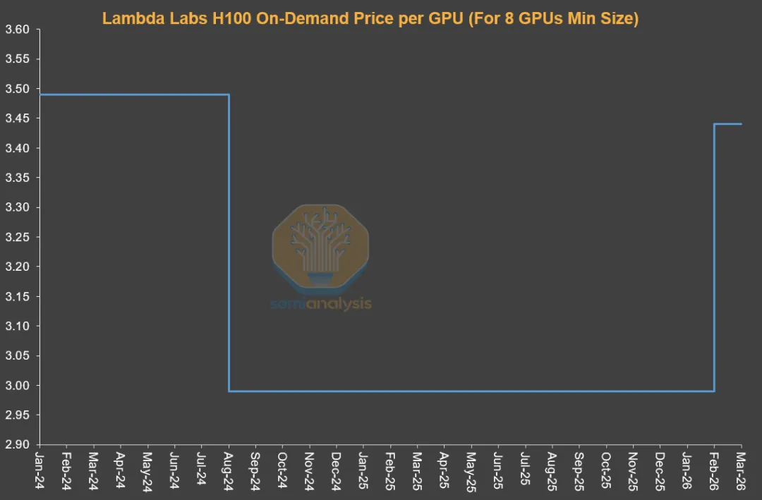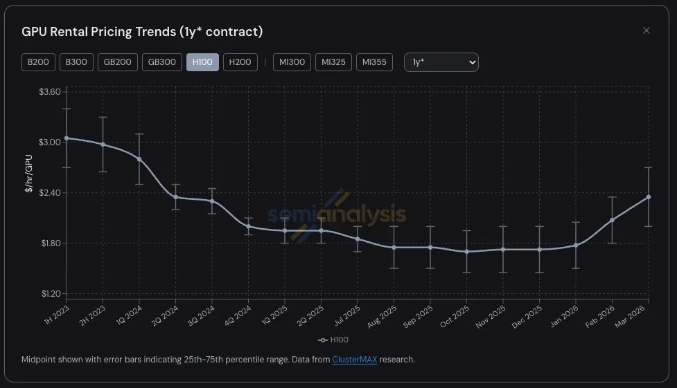 GPU租赁价格成为众多算力相关产品和服务中,最新出现供给紧张、价格大幅上涨的领域。H100 GPU一年期租约合同价格已从2025年10月的低点每小时每GPU 1.70美元急升至2026年3月的2.35美元,涨幅接近40%。