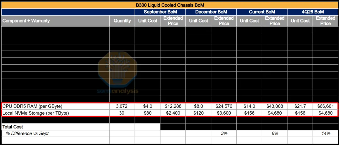 2026年1月成为下一个关键拐点:内存价格(DRAM和NAND)在连续多个季度上涨后,开始呈现"指数级爆发"。根据SemiAnalysis的存储模型,LPDDR5和DDR5的合同价格预计将分别上涨约4倍和5倍。