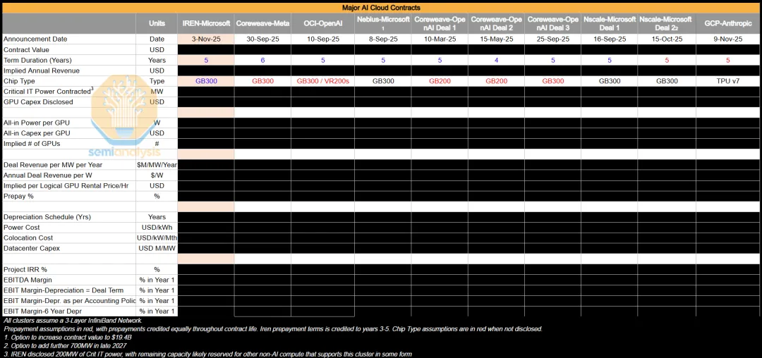 下表展示了一些大型承购交易。SemiAnalysis对这些交易进行了深入分析,以测算其隐含定价(以美元/小时/GPU计)以及项目内部收益率(IRR)、息税前利润率(EBIT Margin)等盈利指标。