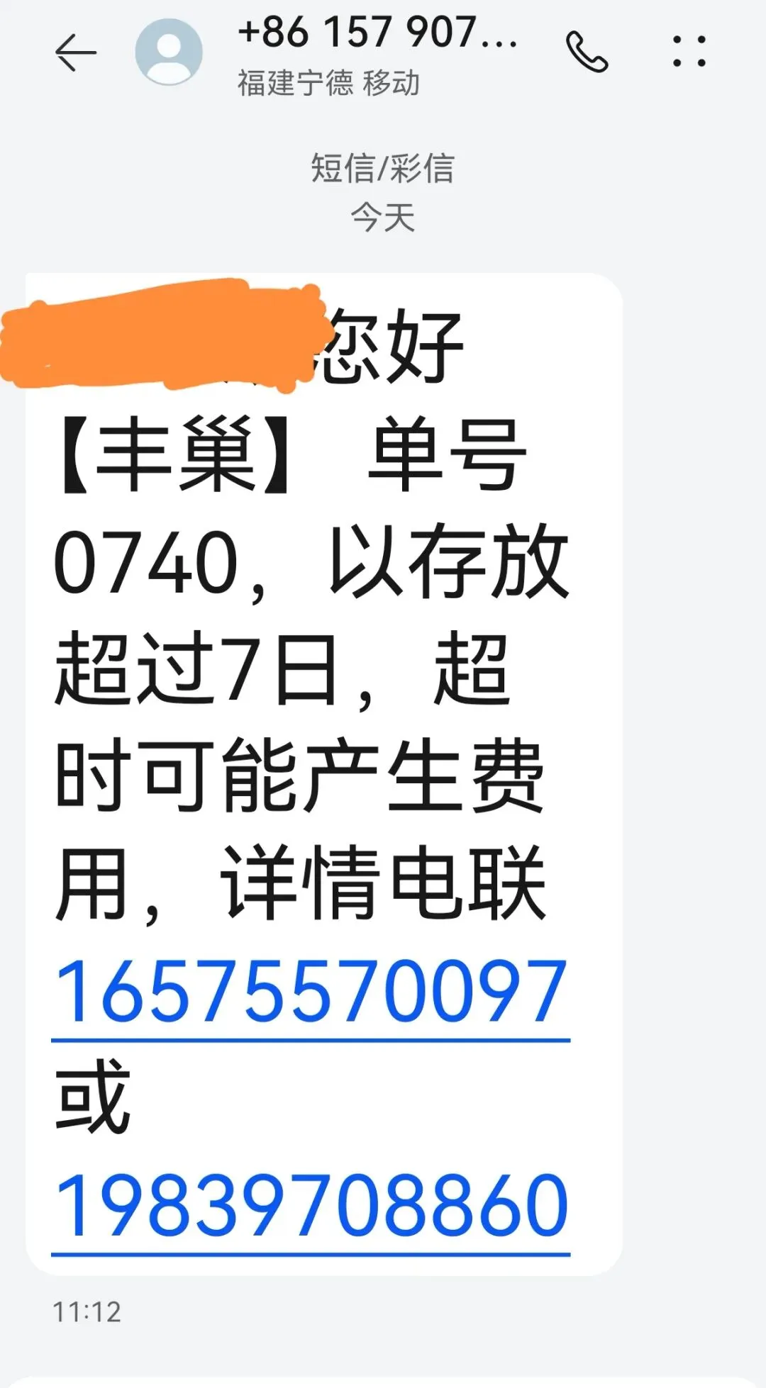 这不,连续两天都收到号称丰巢快递的快递放置延时收费提醒的短信,而且,短信开始就直接说出我的名字,最后还“友情提醒”一下,超时可能产生费用,详情电联,然后就是一串的电话号码。第一次,我查看了一下订单,除了在途的,送到的该取的都取了,根本没有超时的情况,就没理他,可没想到,隔了一晚上,短信又来了,而且连快递单号都标注的清清楚楚的。
