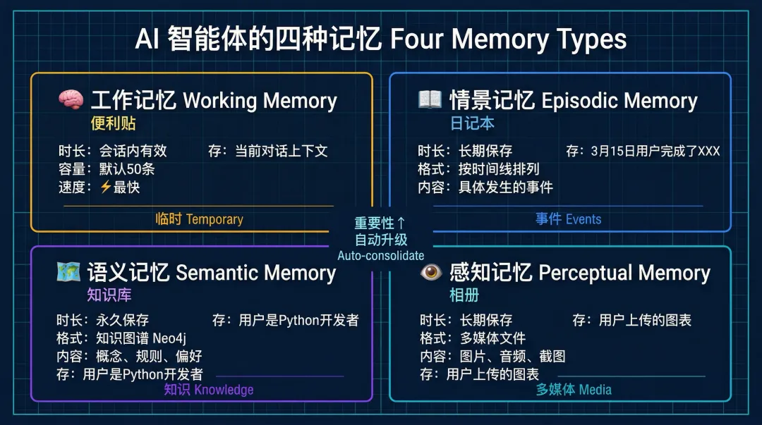 AI 的记忆系统 = 工作台(工作记忆)+ 日记本(情景记忆)+ 知识库(语义记忆)+ 相册(感知记忆),还配了自动整理和遗忘机制。