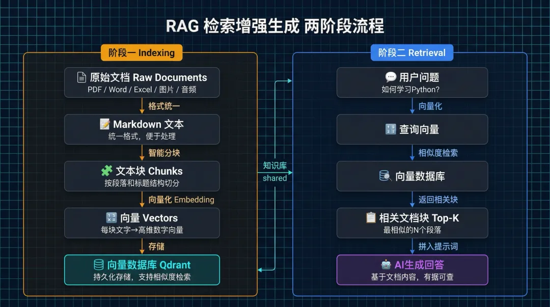 你的文档(PDF/Word/Excel/图片/音频) ↓ 统一转成 Markdown 格式 ↓ 按段落和标题结构分成小块(分块) ↓ 每块文字转成向量(嵌入) ↓ 存进向量数据库(Qdrant)这里有个设计亮点:所有格式的文档都先统一转成 Markdown,这样无论是 PDF 的章节、Excel 的表格、还是图片里的文字(OCR),都用同一套分块逻辑处理。