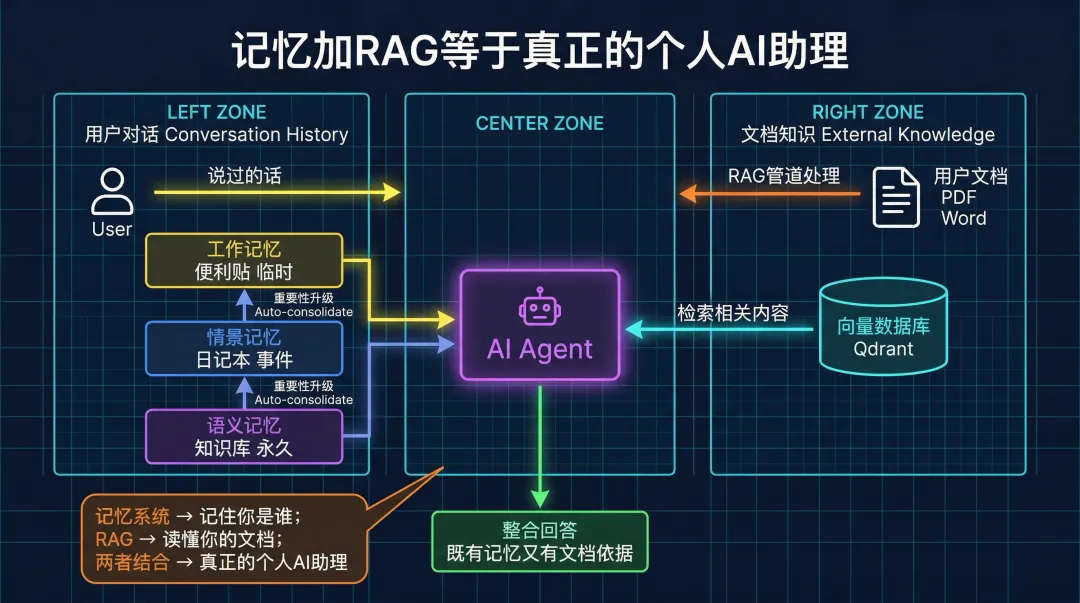 • RAG 负责"外部知识"——你给它的文档 • 记忆系统负责"交互历史"——你说过的话、做过的事