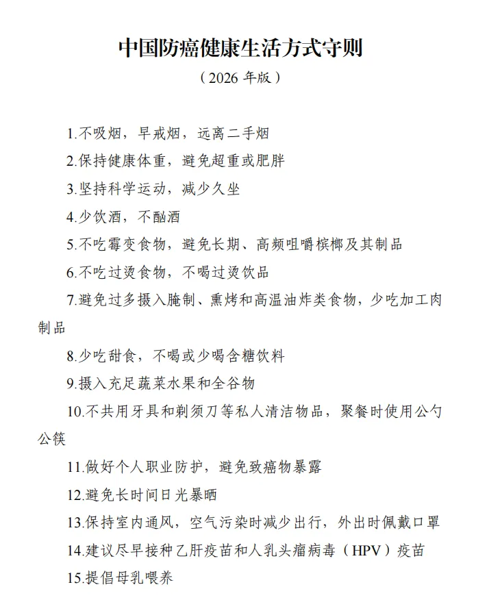 最近,国家卫生健康委正式发布了《中国防癌健康生活方式守则》——它不是晦涩难懂的医学论文,也不是夸大其词的养生噱头,而是一本人人能看懂、照着做就能降低患癌风险的“官方防癌说明书”。15条防癌法则,覆盖生活方方面面,很多人第一条就没做到。(来源:人民日报健康客户端、国家卫生健康委官网)